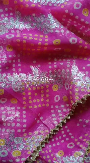 Pure chiffon saree in leheriya diagnal weaving , with beautiful bandej design and blouse in contrast