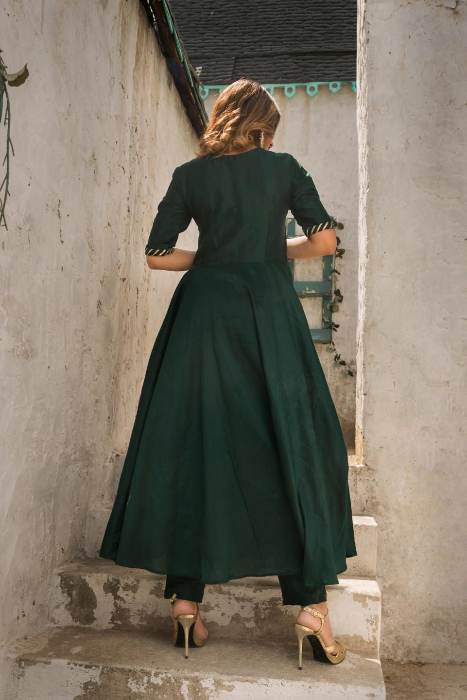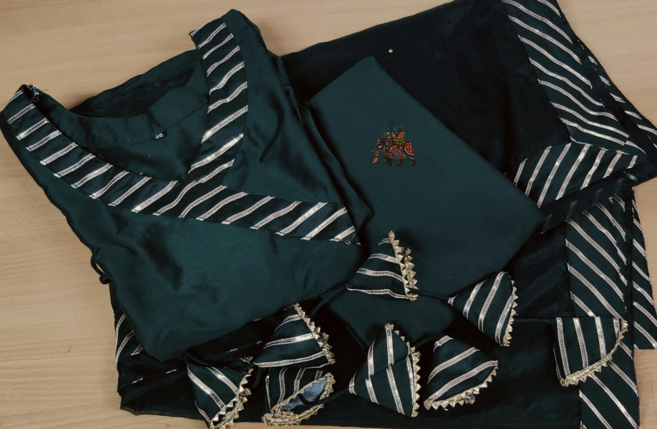 Beautiful cotton silk angrakha gown with gotta detailing on neck with tassels and gotta border on sleeves paired with cotton silk pant with gotta detailing and elegant organza duppata