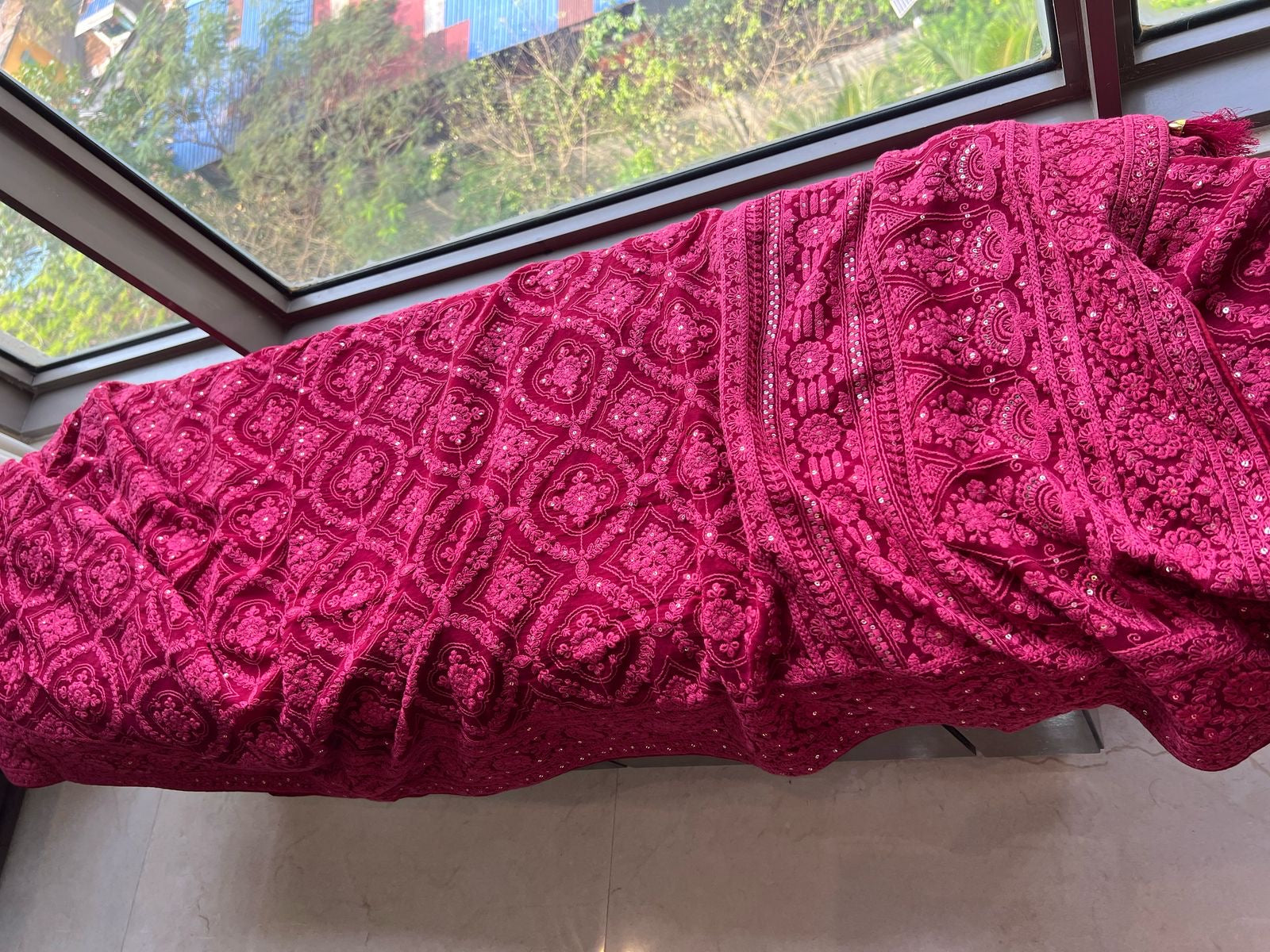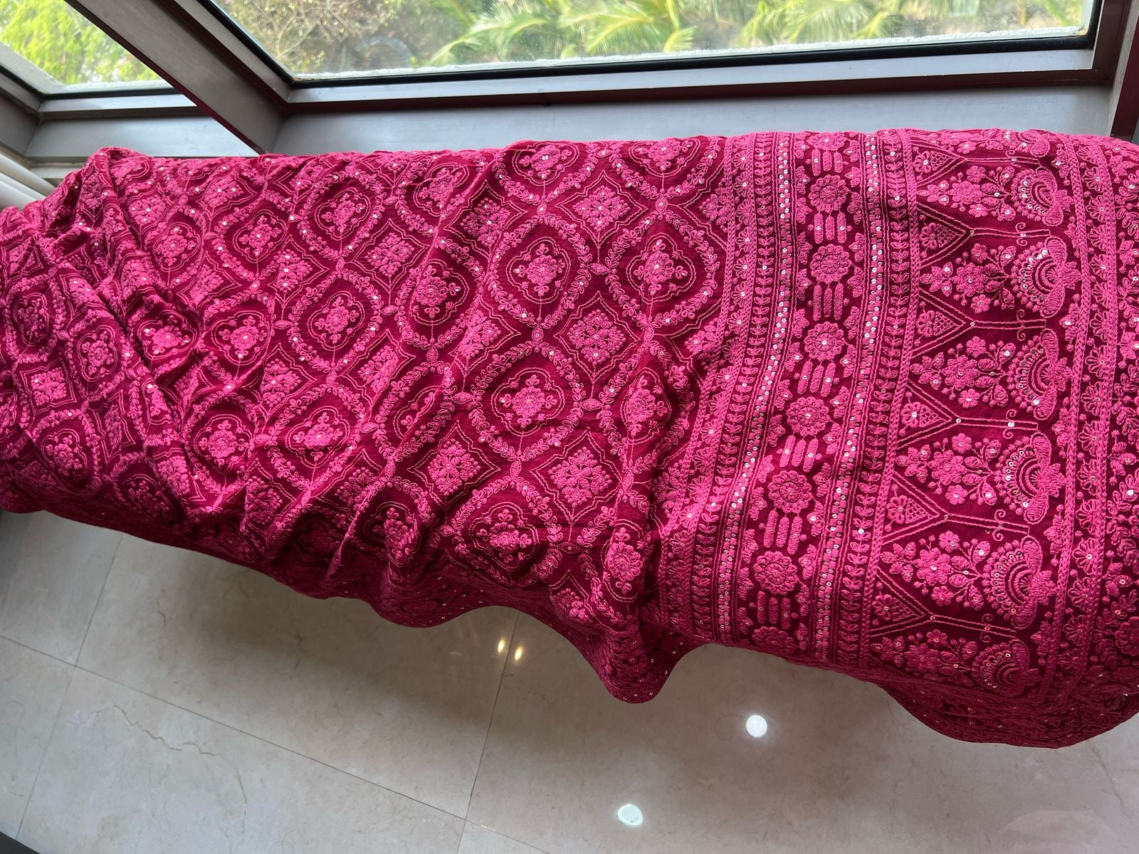 This Gorgette saree features vibrant Chikankari embroidery, adding a touch of traditional elegance to any wardrobe. The set includes a matching blouse piece for a complete look. Made with lightweight and breathable fabric, this saree is perfect for any occasion and offers a comfortable fit.