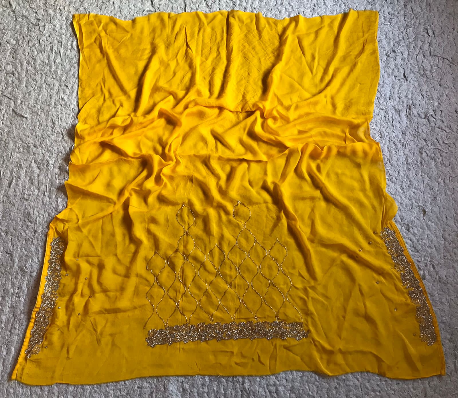 Yellow Premium Pure Chinnon Crepe Chiffon drapes of feather soft luxury embellished with jaal cut daana handwork & running jaal handwork bp